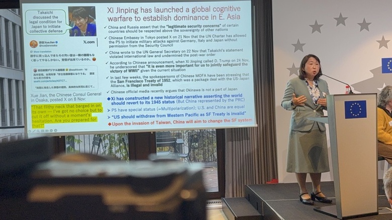 第4屆柏林台灣會議4日登場,會議第一天聚焦歐洲印太政策與中國軍事威脅,在「台灣的海事安全與區域穩定」座談中,安全政策專家、九州大學教授益尾知佐子指出,中國正透過全球性認知戰,企圖重塑國際秩序,台灣一旦有事,也將深刻改變國際秩序。(中央社記者林尚縈柏林攝)