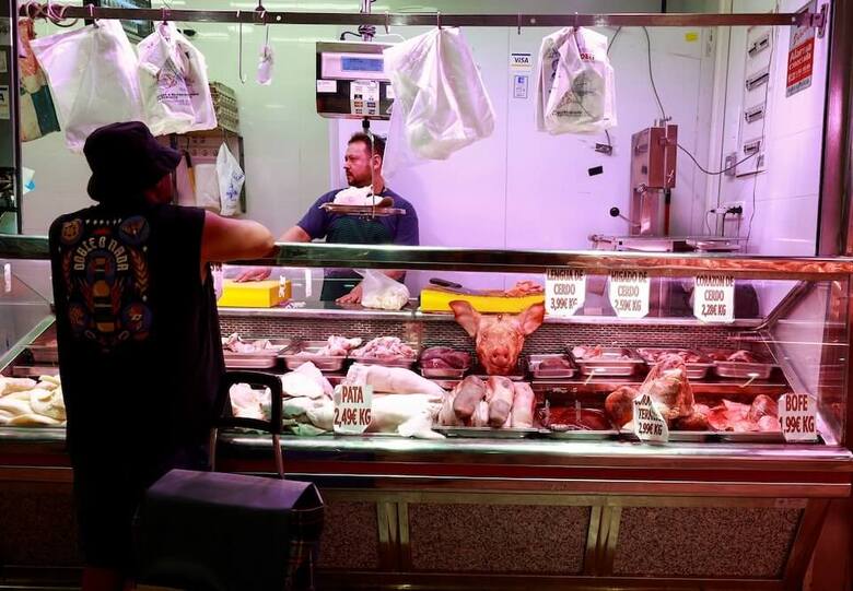 圖為西班牙馬德里一處豬肉攤。(路透社)