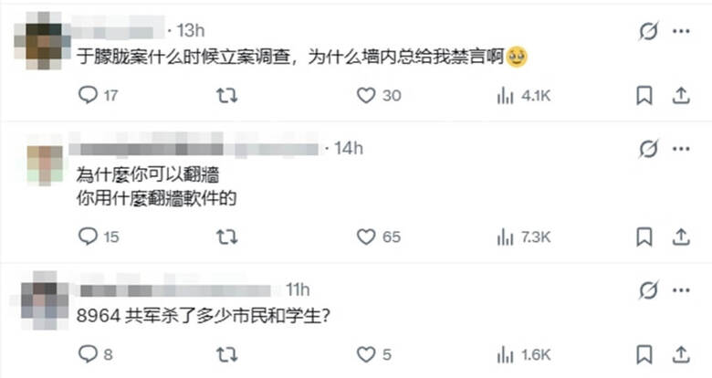 回覆這篇貼文的內容堪稱五花八門,有網友留言「為什麼你可以翻牆,你用什麼翻牆軟件(體)的」、「為啥你可以翻牆」、「不是啥時候讓百姓能看到你的帖子」、「中國軍方也翻牆囉!火箭軍好像清洗的勤快!」