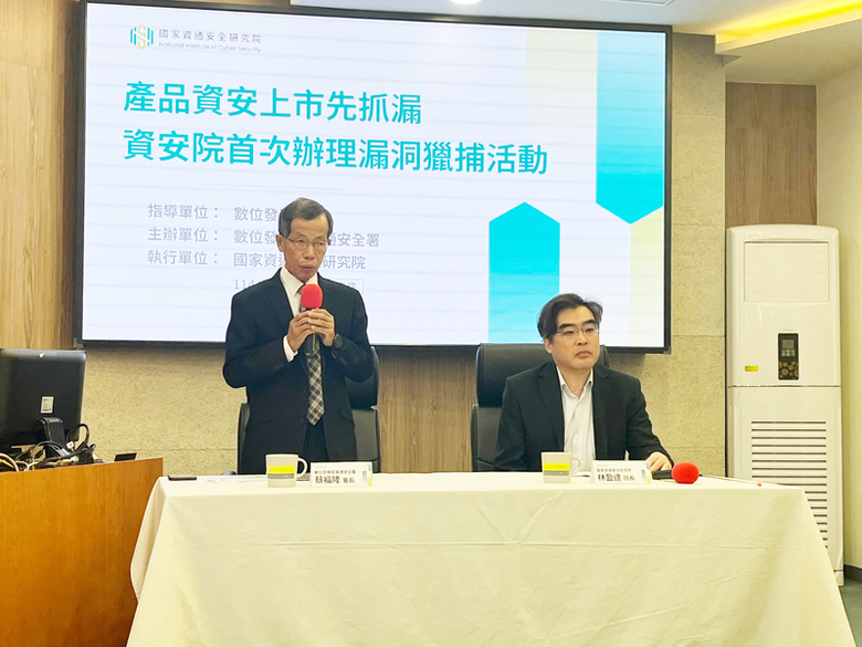 國家資通安全研究院10日舉辦產品資安漏洞獵捕活動記者會,數發部資安署長蔡福隆(左)、資安院長林盈達(右)出席。(中央社記者趙敏雅攝)