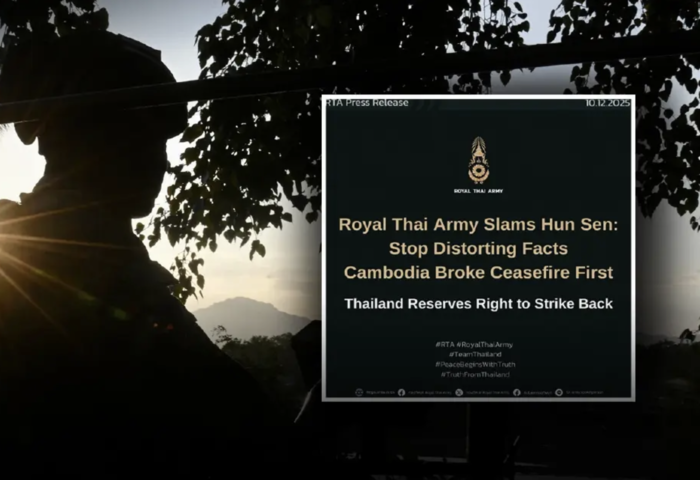 (台泰時報12月11日電)泰國陸軍回應柬埔寨方面最新指控,重申泰方並非邊境衝突的挑釁者,並強調相關軍事行動屬於自我防衛。先前柬媒報導稱,柬埔寨前首相洪森(Hun Sen)向前線部隊發布緊急訊息,聲稱已與總理洪瑪內(Hun Manet)共同指揮作戰,並指責泰軍動用重型武器攻擊柬方陣地,意在製造刺激,藉機撕毀停火協議。對此,泰國陸軍否認相關指控,並指出柬方說法有失準確。