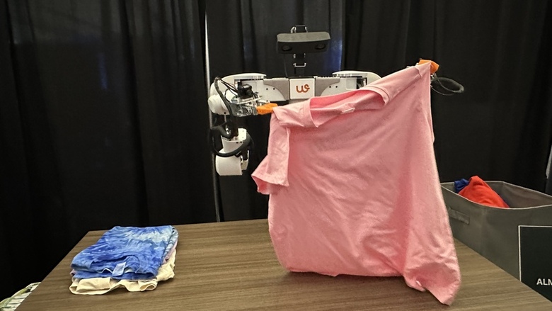 矽谷人形機器人高峰會11日登場,Weave Robotics在現場展出可協助家務的機器人,能從撿起衣物、摺疊到堆放一氣呵成,已在舊金山展開商用部署,進駐自助洗衣店。(中央社記者張欣瑜舊金山攝)