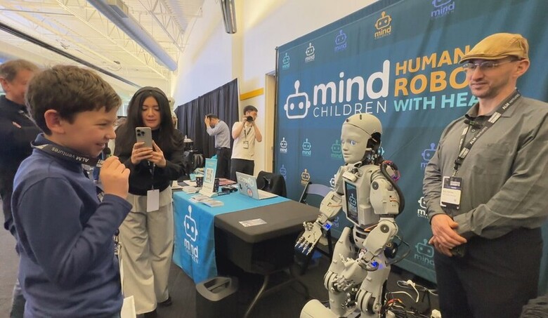 (中央社舊金山11日電)人形機器人為科技界的下一個激烈戰場,矽谷人形機器人高峰會今天登場,近40家機器人、元件廠商參展,除家事型機器人,能以人性化方式與人對話的社交型機器人也亮相,宛如實體ChatGPT。美國小學生說,未來若家中出現機器人,「可能會有些害怕,但最終會習慣」。
