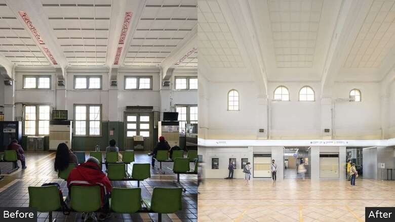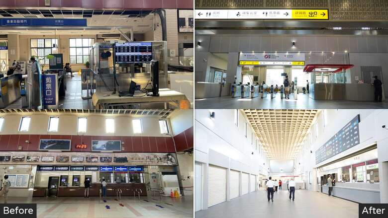 左圖為鶯歌車站改造前,存在資訊及色彩雜亂問題;右圖改造後將淡化場域色彩,將視覺重點留給重要資訊,且相較其他車站微改造,鶯歌車站增添台鐵窗花並保留「鶯歌紅」元素。(取自設研院官網)