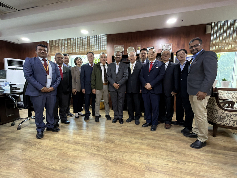 駐印度副代表謝柏輝(右4)於12日中午的宴客期間,突然感到身體不適,開始抽搐。相關人員緊急對謝柏輝實施CPR,並將他送醫,醫院搶救後仍宣告不治。圖為謝柏輝4日參加印度「國家地震中心」的國家地震預警資料接收中心啟用儀式。(中央社記者李晉緯新德里攝)