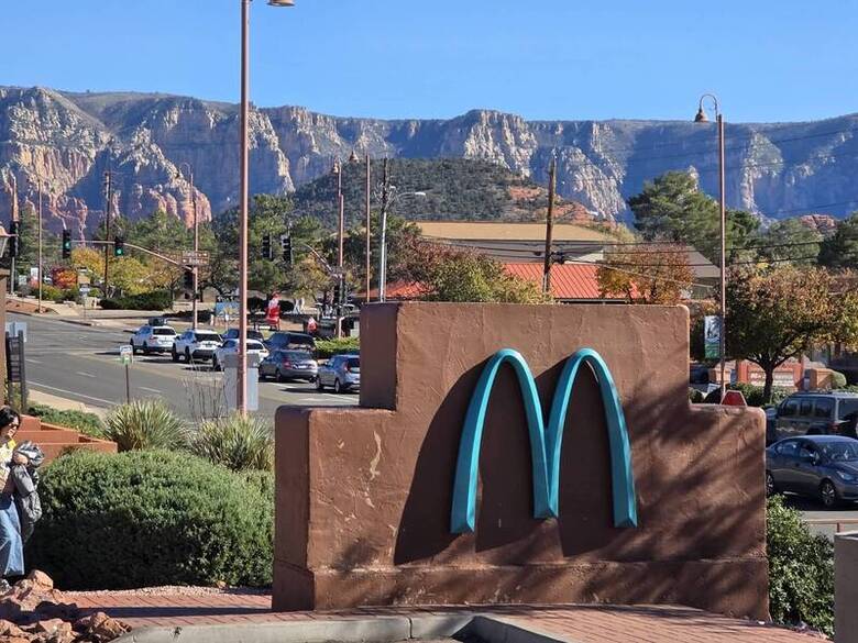 塞多納以壯麗的紅岩景觀聞名,當地政府為維護自然地貌,自1990年代起即要求建築外觀不得破壞視覺調性。1993年在此開幕的麥當勞因而將經典黃色M字招牌改為綠松石藍(Turquoise blue)。(中央社記者江明晏攝)