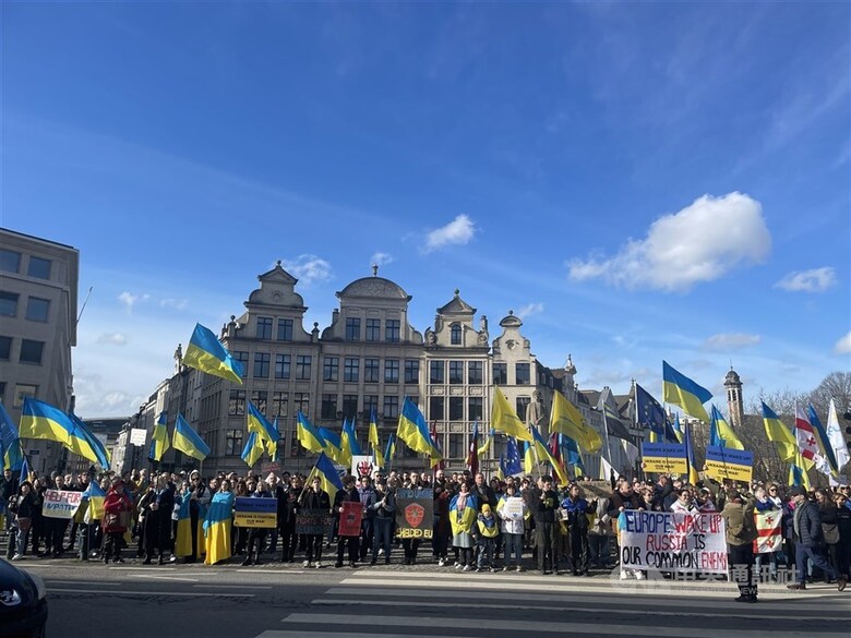 圖為烏克蘭人及支持者今年稍早正逢俄烏戰爭3週年時,齊聚歐盟總部所在的布魯塞爾表達訴求。(中央社檔案照片)