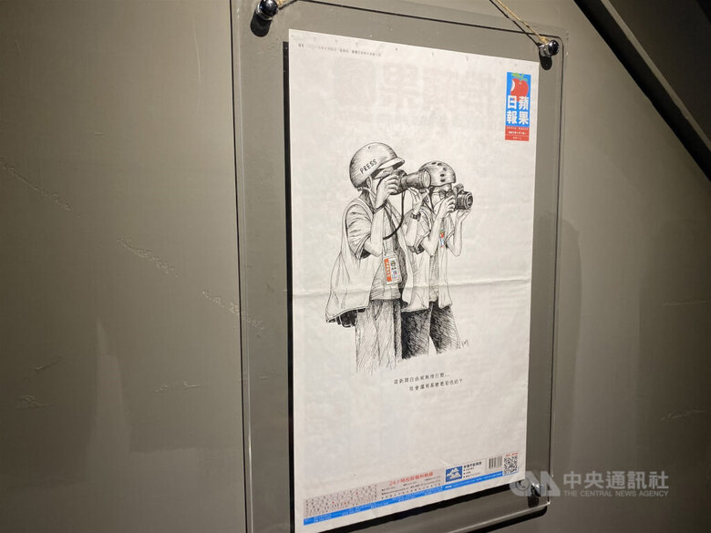 台灣漫畫基地「反抗的畫筆–香港反送中運動週年圖像展」展示香港藝術家Kay Wong以香港蘋果日報2019年7月4日出版的空白頭版作為畫布所創作作品,描繪在反送中運動時期,新聞媒體報導自由遭打壓。(中央社檔案照片)