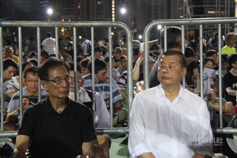 香港民主黨前主席李柱銘(左)和壹週刊集團老闆黎智英(右)2017年6月4日參加支聯會舉辦的「六四」燭光晚會。(中央社檔案照片)