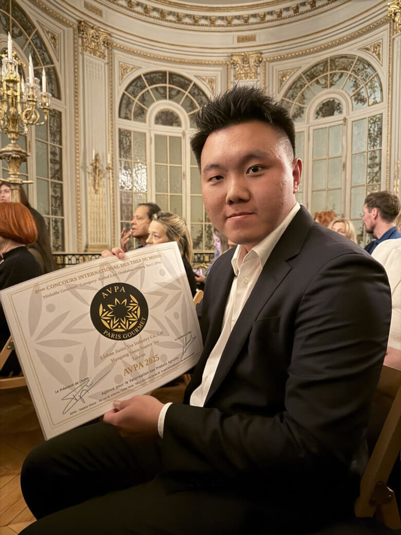 聚鑫製茶廠執行長謝忠霖日前帶著生產的「華崗雪源頭」茶葉,參加法國茶葉國際大賽,因烏龍茶的風味獨特,獲主辦單位頒發「特別獎」。(謝忠霖提供,中央社記者趙麗妍傳真)