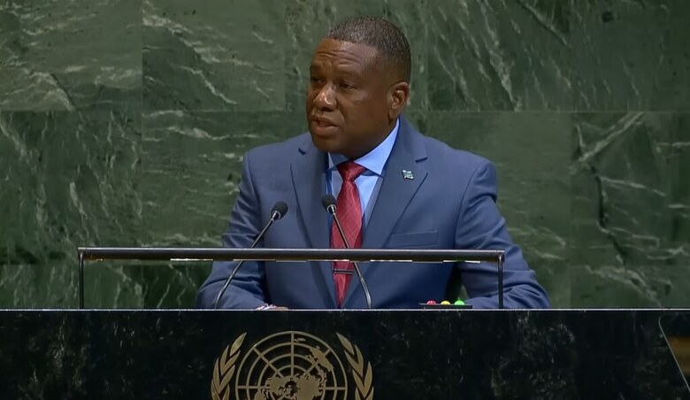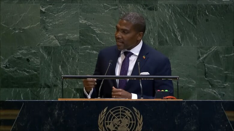 聖克里斯多福及尼維斯總理德魯的27日在聯合國大會發表談話,為台灣參與國際組織發聲。(圖取自聯合國YouTube頻道youtube.com)