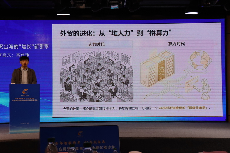 來自台灣的高仕瑋在該平台提供的協助下,創辦了南京增長跨境科技有限公司。他今天分享如何利用AI技術幫助從事外貿的公司拓展客戶,主要是藉由AI低成本生成專業內容吸引客戶,然後運用AI客服解決外貿時差問題,引導客戶下單,也就是讓外貿工作從拚人力進化到比算力。