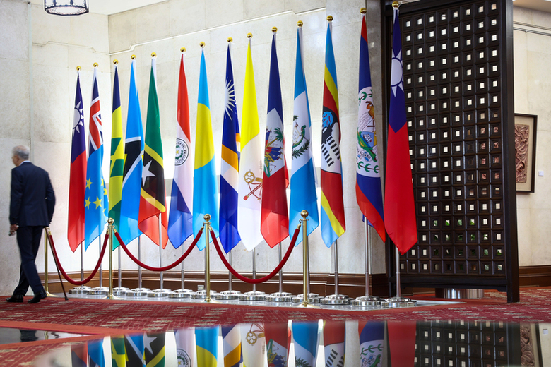 中國外交部發言人郭嘉昆稱台灣濫施「金元外交」,外交部17日嚴正駁斥其「無恥謬論」,並指出,榮邦計畫以價值為本、以人民福祉為核心,推動國際共榮發展的合作理念。圖為外交部正門口友邦國旗。(中央社記者王騰毅攝)