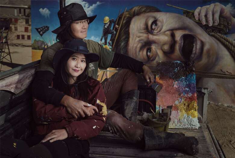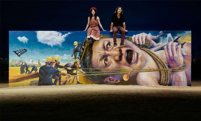 流亡倫敦的香港藝術家夫妻檔「淋漓淋浪」在美國自由雕塑公園完成巨幅壁畫,兩人坐在壁畫上,顯得渺小。(Jonas Yuan攝)