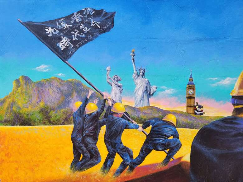 畫裡還可看到香港獅子山、中國民主女神像、美國自由女神像、英國倫敦大笨鐘,在大笨鐘旁冒出了一隻可愛黑熊,竟是台灣高雄市的吉祥物「高雄熊」,一系列巧思象徵港人與各民主自由國家的連結。