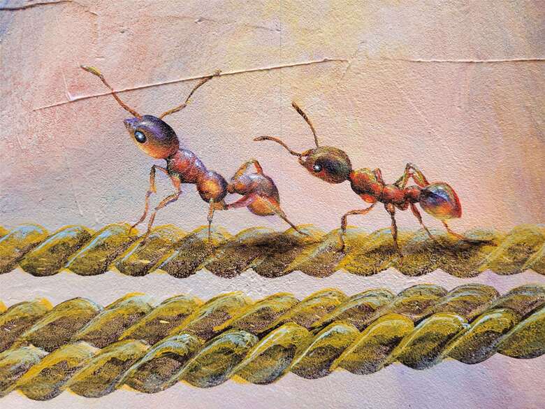 整幅畫作藏有豐富的細節,左上角的兩朵白雲,狀似香港和美國的地圖,右上角的烏雲,則狀似中國的版圖;在綁住習近平的繩索上,出現兩隻小螞蟻,象徵港人「螞蟻雄兵」,眾志成城的韌性;壁畫的左半邊,融入美國「硫磺島戰役」經典照片的景象,但揮舞的是「光復香港 時代革命」的旗幟。