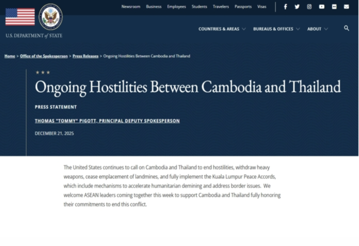 根據美國國務院21日公布的聲明,副發言人托馬斯・皮戈特(Thomas Pigott)指出,美方持續敦促泰國與柬埔寨遵守先前共同簽署的相關聲明,全面履行停火承諾,包括撤除武裝與停止任何可能危及平民安全的行為。美方同時對東協於本週促成各方會晤表示肯定,期待透過多邊機制推動衝突降溫。