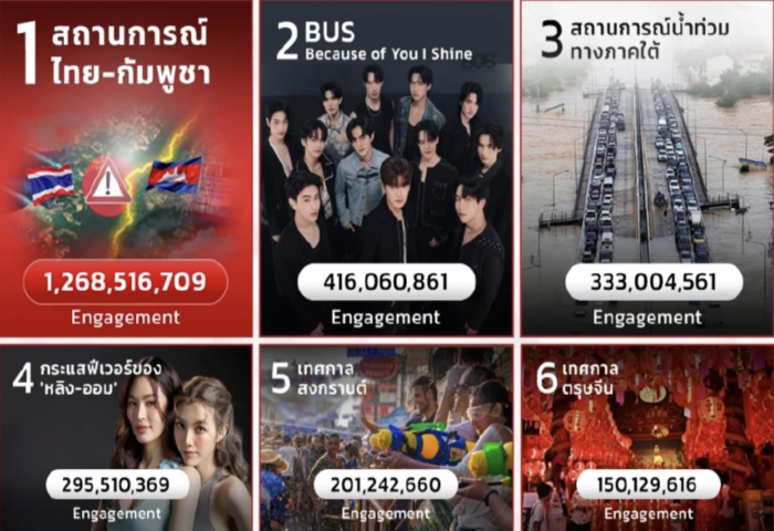 Wisesight 總結指出,2025年泰國社群輿論高度集中於三大面向:國際關係與國家認同、災害與公共安全,以及娛樂文化所帶來的集體情感連結,反映社群平台已成為形塑公共議題與社會氛圍的重要場域。