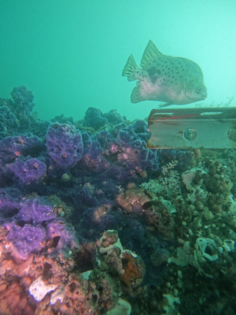 台電離岸一期實施24小時水下監測,經學術單位專家顧問協助分析,離岸一期周遭白海豚等哺乳類現跡,風機基座布滿藻類亦吸引魚類棲息。(台電提供,中央社記者曾智怡傳真)