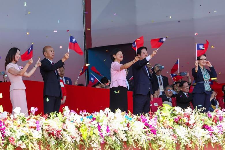 總統賴清德(前左4)、副總統蕭美琴(前右)、立法院長韓國瑜(前左2)等人10月10日在國慶大會上揮舞中華民國國旗。(中央社檔案照片)