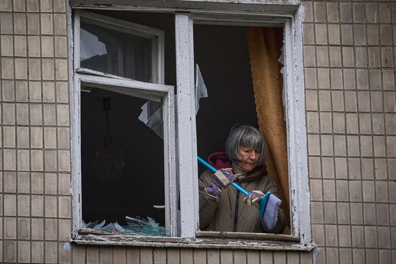 烏克蘭首都基輔一處公寓遭俄羅斯無人機襲擊,一名女性23日在窗邊清除玻璃碎片。(美聯社)