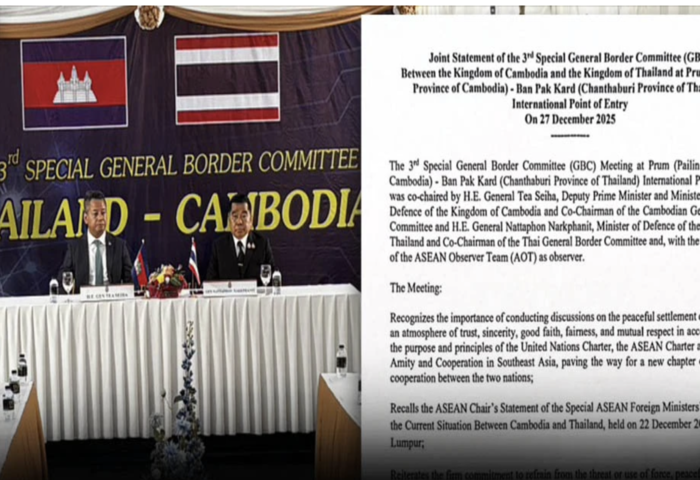 (台泰時報12月28日電)泰國與柬埔寨27日於一般邊境委員會(GBC)特別會議中簽署聯合聲明,雙方同意自當日中午12時起全面停火,涵蓋所有武器與軍事行動,並設72小時觀察期,由東協觀察團(AOT)負責監督。會議於柬埔寨拜林府永久關卡對應泰國尖竹汶府班帕卡德關卡舉行。
