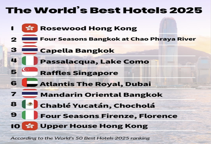 根據榜單,香港的 Rosewood Hong Kong 奪下全球第一名,成為2025年最受肯定的頂級飯店。第二名則由曼谷昭披耶河畔的 Four Seasons Bangkok at Chao Phraya River 拿下,以河岸景觀與完整度假設施獲得高度評價。