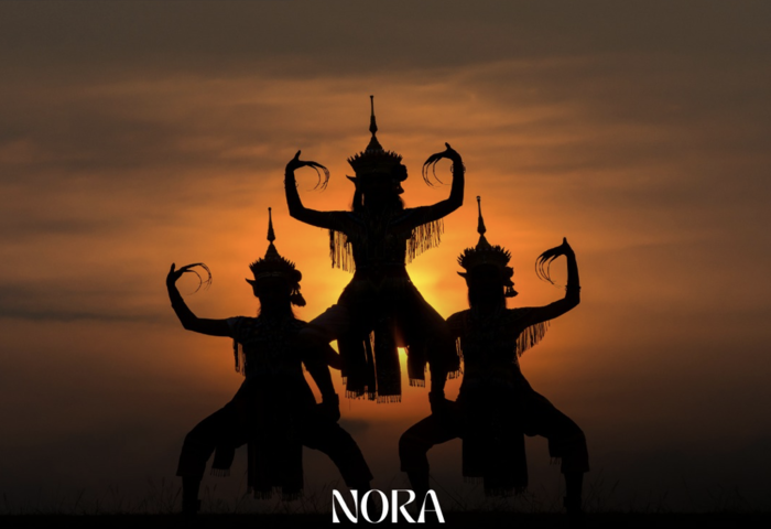 諾拉舞起源於泰國南部多個府,歷史可追溯至七百多年前。其舞蹈特色包括節奏鮮明的腳步、具張力的定格動作,以及細膩而銳利的手勢變化,展現力量與秩序並存的表演形式。舞者所穿著的服飾多以珠飾、彩布與高冠構成,外型帶有神話與王權意象,屬於高度制度化的傳統裝束。