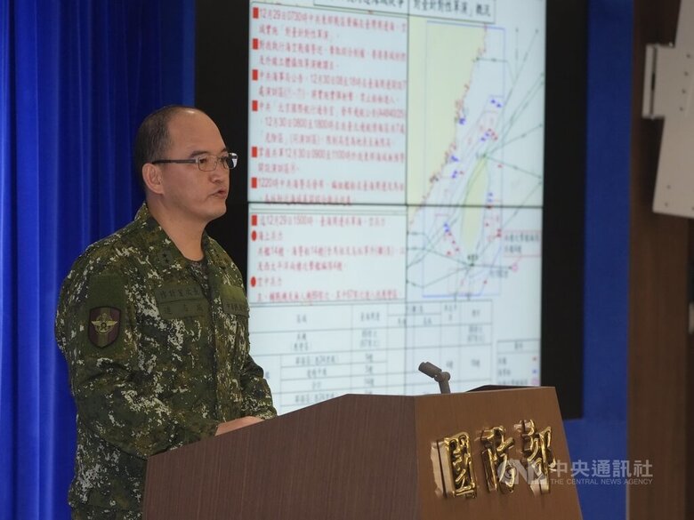 中國解放軍東部戰區29日以「正義使命-2025」為名在台灣周邊實施針對性軍事演習。國防部作計室次長連志威中將在國防部記者會說明。(中央社記者徐肇昌攝)