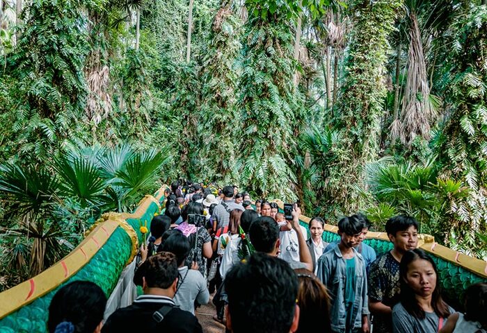 通往聖島的橋樑入口處,民眾需依序排隊進場,現場由工作人員實施人流管制,採取兩列進場、一列離場方式,以維持秩序與安全。信眾進入島內後,陸續前往祭祀區,向地方信仰核心的西素托祖父神(Pu Si Suttho)與巴通瑪祖母神(Ya Prathumma)參拜祈福,祈求新的一年事業順利、家庭平安與生活順遂。