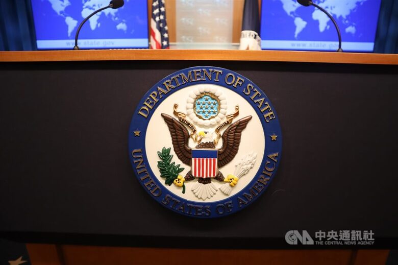 中共日前軍演,美國國務院1日敦促北京克制,停止對台灣施加軍事壓力。圖為美國國務院簡報室講台。(中央社檔案照片)
