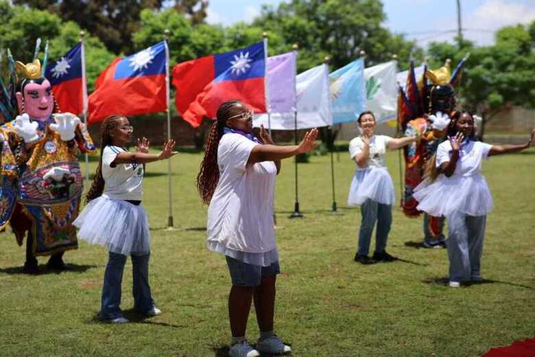 南非僑界1日舉行元旦升旗典禮,中華民國國旗與南非僑團會旗隨風飄揚,南非青少年以電音三太子舞曲等表演帶動現場氣氛。(中央社記者李依璇約翰尼斯堡攝)