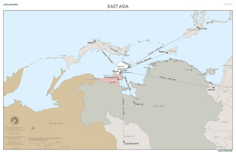 該地圖顯示出,駐韓美軍與平壤、北京、台北、馬尼拉等附近主要城市的距離,這展現美國軍隊駐紮韓國的更廣泛戰略優勢。