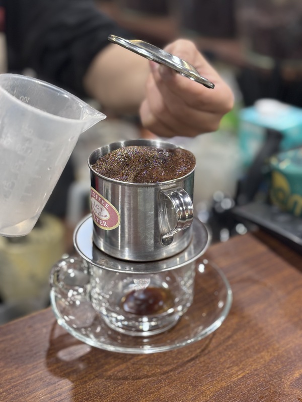 越南用金屬滴漏器(Phin)沖製咖啡的歷史源於19世紀法國殖民時期。滴漏器底部有孔,無需濾紙。因當時鮮奶稀少,越南人改用甜煉乳來調和濃烈的羅布斯塔咖啡,創造出獨特風味。(中央社記者曾婷瑄河內攝)