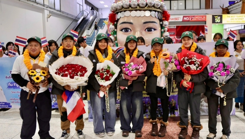 (台泰時報 1 月 9 日電)在家人與師長的掌聲中,清萊府迎回在國際舞台奪冠的年輕學子。清萊職業技術學院美術設計科學生組成的「Fighting Frost TH」團隊,日前於哈爾濱市舉行的 2026 年國際大專雪雕大賽(ICSSC 2026)勇奪冠軍,9 日清晨返抵湄法鑾清萊機場,現場氣氛溫馨熱烈。