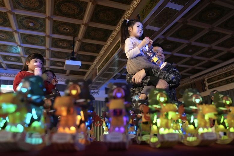 交通部觀光署9日在台北圓山大飯店舉行2026台灣燈會主燈暨小提燈造型發表記者會,小朋友拿著新亮相的「喔熊馬抵嘉」小提燈,十分可愛。(中央社記者徐肇昌攝)