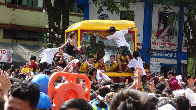 菲律賓天主教規模最大年度宗教盛事「黑拿撒勒人出巡」9日在馬尼拉市登場,民眾不顧危險攀爬神像座駕,用白毛巾擦拭玻璃框,獲得祝福。(中央社記者林行健馬尼拉攝)