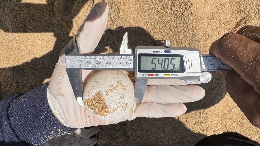調查結果確認為 1 座革龜巢穴,位置座標為 UTM 417890E、003654N。現場可見前肢划行痕跡寬約 160 公分,龜體胸寬約 70 公分。經開挖檢測,在約 30 公分深處發現龜卵,平均直徑約 5.40 公分,目前正進行巢址安全性與環境適宜性評估。