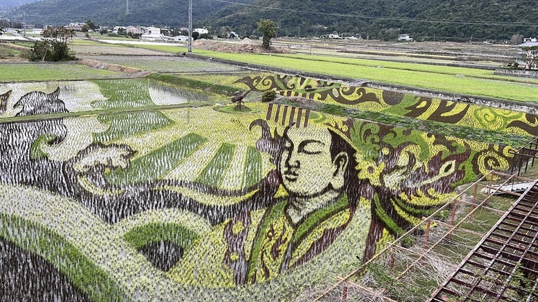 米國學校2026年的彩繪稻田創作「天后邸家」,將媽祖的莊嚴化作大地的色彩。(中央社記者盧太城台東攝)