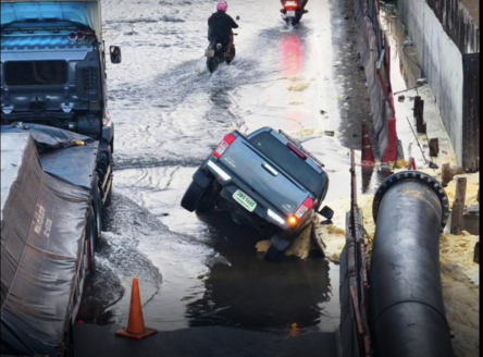 (台泰時報 1 月 17 日電)泰國通往曼谷的重要幹道拉瑪 2 路,今晨發生路面塌陷事故。一處往曼谷方向的平行車道突然崩塌,形成大型天坑,一輛行經現場的皮卡車不慎墜入,造成該路段雙向交通嚴重回堵,相關單位緊急封路處理。