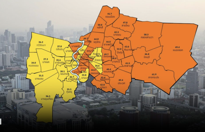 依區域分布觀察,曼谷北部與東部多處測站數值介於 38.8 至 64 微克/立方公尺,整體評估為開始影響健康;市中心與南部亦呈現相同等級。僅吞武里南、北部部分區域仍維持中等空氣品質。