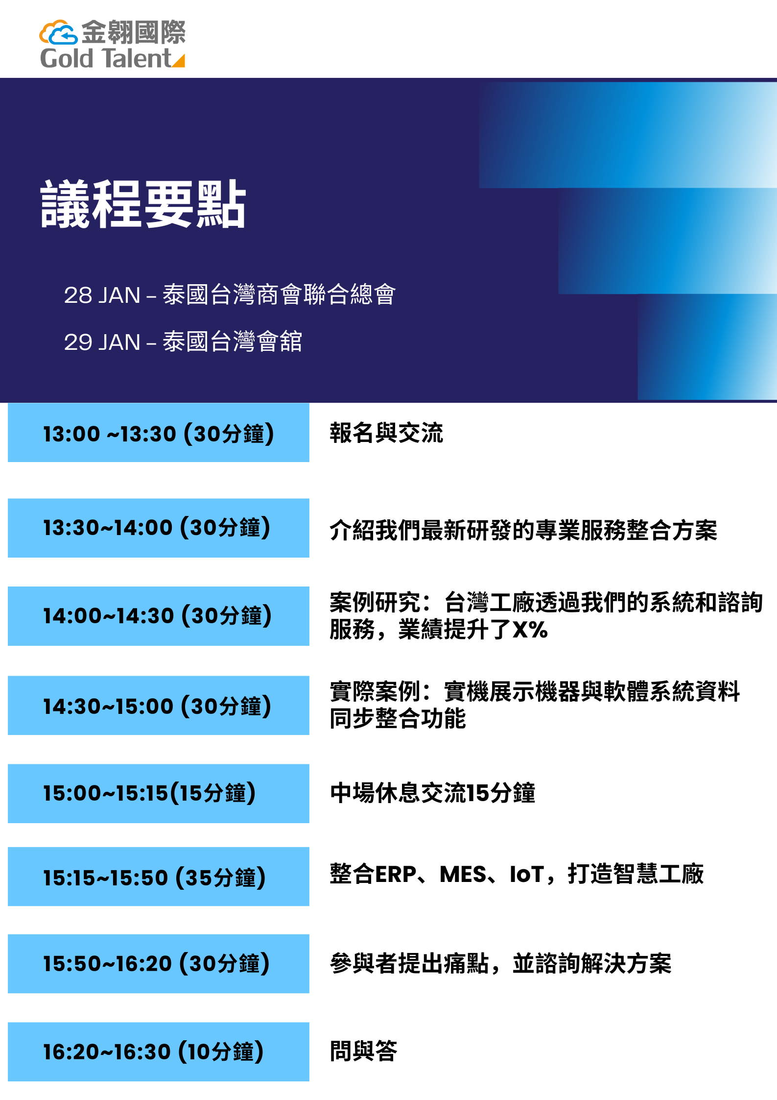 【台泰時報曼谷電】隨著製造業加速導入數位化管理,如何讓企業資源規劃系統、製造執行系統、IoT,與生產現場真正接軌,成為旅泰台商與在泰製造業普遍關注的課題。為回應此一趨勢,金翱國際(Gold Talent International)攜手冠理科技股份有限公司(QUALI of Chiangs Group),將於 1 月底在曼谷舉辦「ERP、MES 與 IoT 整合智慧工廠」主題專題說明會,聚焦製造業在系統整合與數據即時化過程中的實務挑戰。