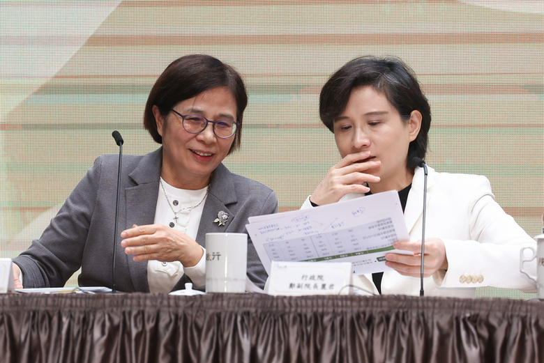 行政院20日舉行「台美關稅談判說明記者會」,擔任台灣談判代表的副院長鄭麗君(右)、政委楊珍妮(左)出席,兩人在會中針對報告內容交換意見。(中央社記者王騰毅攝)