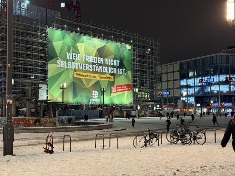 「兵役現代化法」上路後,德國各地出現不少聯邦國防軍募兵廣告,其中柏林市中心亞歷山大廣場(Alexanderplatz)近日懸掛的超大型招募看板,引發社會關注。