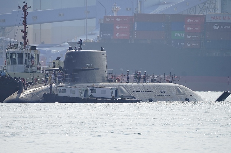 潛艦國造原型艦「海鯤號」21日下午再度現身,艦上站著許多測試人員。台船表示,試航準備依計劃進行。(中央社記者董俊志攝)