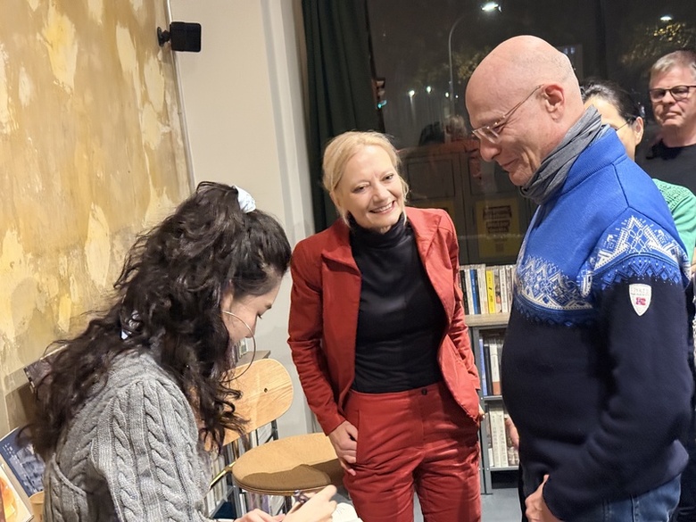 德國資深譯者白嘉琳(中)翻譯之餘,也在德國向當地讀者介紹台灣作家和文學作品,以譯者角度拉近台德間距離。(中央社記者林尚縈柏林攝)