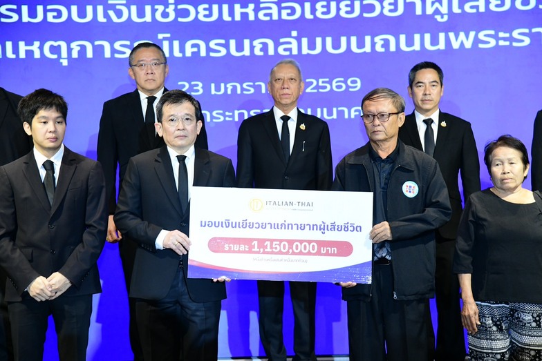 (台泰時報1月23日電)泰國副總理兼交通部長皮帕(Phiphat Ratchakitprakarn)23日於交通部皇家馬車俱樂部禮堂,出席並見證向拉瑪二路高架公路工地坍塌事故罹難者家屬發放補償金儀式。該事故發生於高速公路82號(M82)工程第7標段,位於沙沒沙空府埃卡猜—班佩區間,水泥梁與起重機倒塌釀成傷亡。