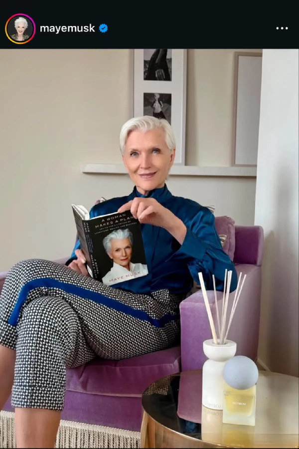 (台泰時報1月24日電)全球社群近日熱議一張 Instagram 照片,主角是世界首富母親、時尚與銀髮族代表人物梅伊・馬斯克(Maye Musk)。原本她是為宣傳個人著作《女人要有計畫:一生的冒險、美麗與成功指南》(A Woman Makes a Plan: Advice for a Lifetime of Adventure, Beauty, and Success)入鏡,卻被眼尖網友發現,畫面右下角悄然出現一組香氛與擴香瓶,品牌正是來自泰國的「Ruenrom」。