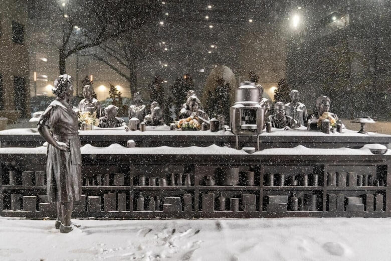 美國奧克拉荷馬市一處廣場的雕像23日被白雪覆蓋。(路透社)