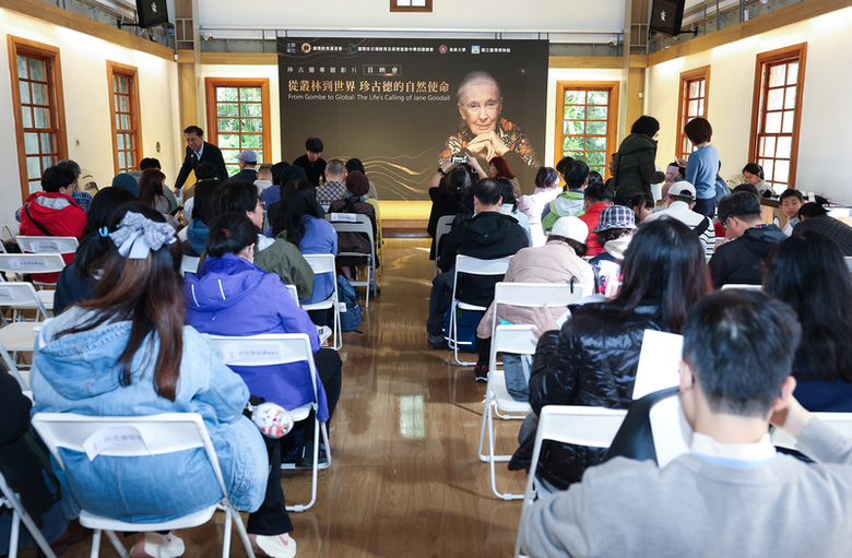 英國著名黑猩猩保育專家珍古德(Jane Goodall)於2025年辭世,以珍古德為主角的專題影片「從叢林到世界-珍古德的自然使命」24日在台北舉行首映會,吸引不少民眾報名觀賞。(中央社記者謝佳璋攝)